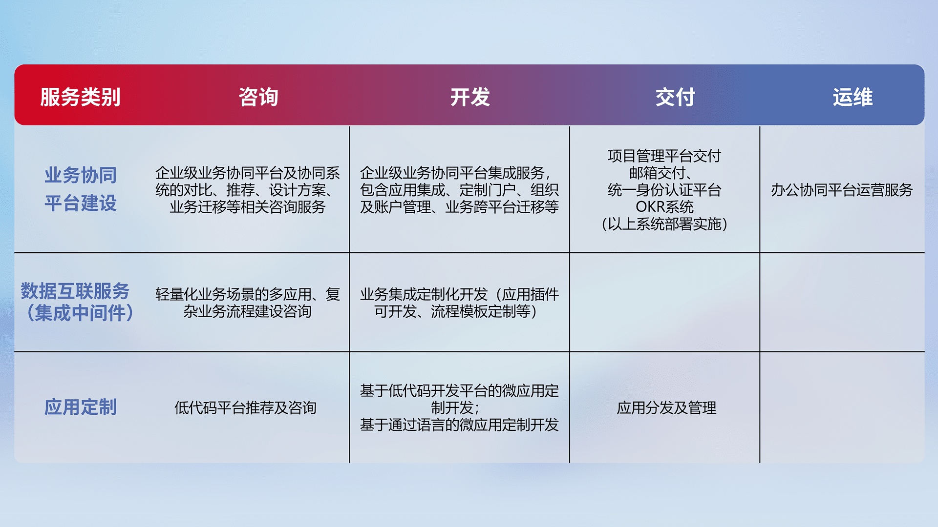针对钉钉、、、企微、、、IDaas等平台级产品提供产品的规划、、方案、、交付、、、定制化开发等服务,,,实现如统一协同办公、、、智能客户服务、、混合会议管理、、智能数据查询、、等业务场景,,实现数字化转型。。。